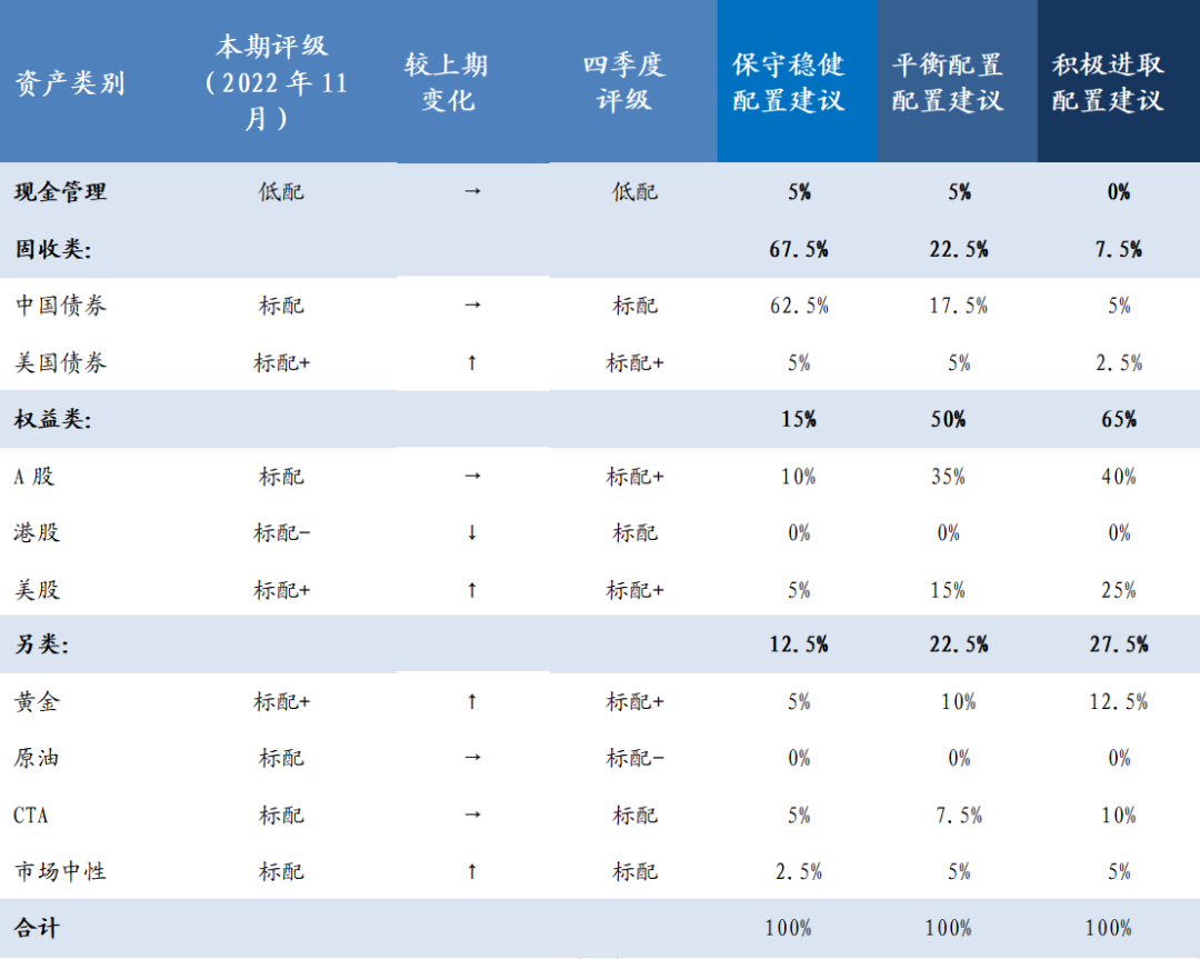 对于2022年11月及四季度大类资产配置,我们建议不同风险偏好的投资者做如下配置比例安排: