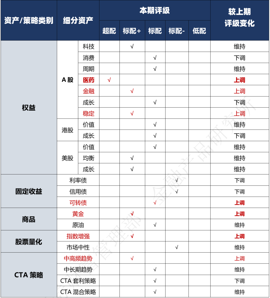 基于对各类资产的趋势和节奏研判,对于积极进取型投资者,我们建议可积极布局权益类资产,逆全球化背景下重视区域分散配置;对于平衡型投资者,建议布局权益资产的同时关注CTA策略和黄金的配置价值及对权益资产的对冲效应,以平滑组合的波动;而对于保守稳健型投资者,在固收资产性价比不高、风险不小、净值化带来持有体验进一步下降的背景下: