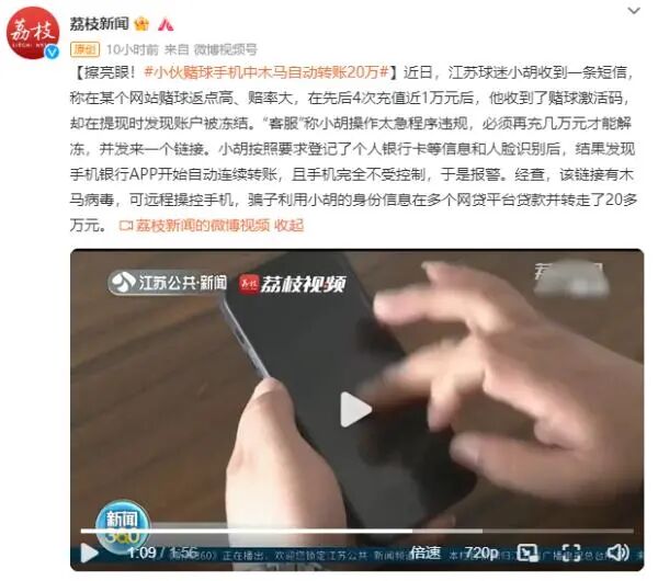 近日,江苏球迷小胡收到一条短信,称在某个网站赌球返点高、赔率大,在先后4次充值近1万元后,他收到了赌球激活码,却在提现时发现账户被冻结。“客服”称小胡操作太急程序违规,必须再充几万元才能解冻,并发来一个链接。小胡按照要求登记了个人银行卡等信息和人脸识别后,结果发现手机银行APP开始自动连续转账,且手机完全不受控制,于是报警。经查,该链接有木马病毒,可远程操控手机,骗子利用小胡的身份信息在多个网贷平台贷款并转走了20多万元。