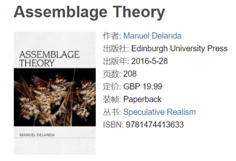 德勒兹和瓜塔里的《千高原》等作品在(美国)社会学基本没人谈;哈曼的作品这两年有些翻译过来,比如《迈向思辨实在论:论文与讲座》和《 铃与哨 : 更思辨的实在论》,但是德兰达(Manuel DeLanda)作品,好像还一本翻译都没有。他的名气比哈曼更大一些,是墨西哥裔美籍的哲学家与艺术家,在普林斯顿大学建筑系任教,所以也在建筑学等领域都有影响,出版著作见下:
