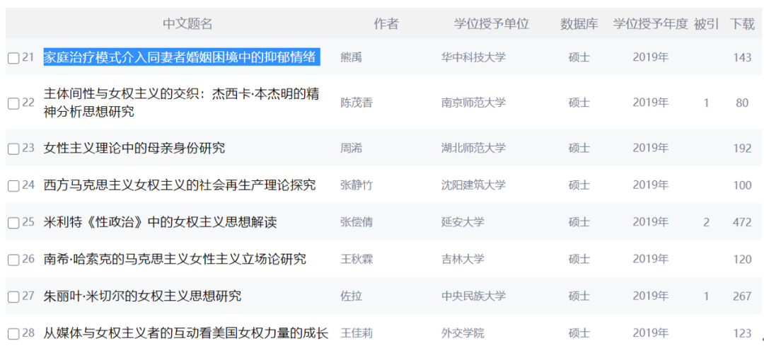 当然,这个分类可能并不对,比如2003届北京大学社会学硕士论文,就有一篇《受苦人:骥村妇女对土地改革的一种情感体验 》,但上面筛选只是限定在“女权主义”的摘要。