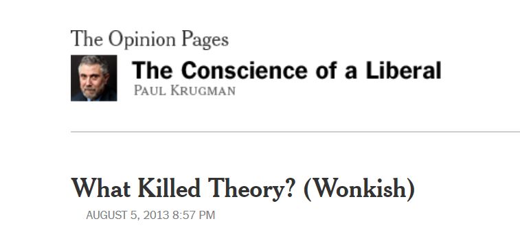 这对于我这种对理论比较感兴趣的人来说其实不算是一个太好的消息。Krugman在纽约时报上发了一篇文章,叫<Who Killed Theory>,他自己是做贸易理论和经济周期理论的,但是他在里面对这两个都开始吐槽。贸易理论的问题是任何一个政策的正当性都能被证明,那这就没有什么指导意义嘛;经济周期理论的问题是这个和现实的观察完全不符合。当然他最后也很老谋深算地补了一句说这只是他个人的观察,因果关系的证明需要更多数据。