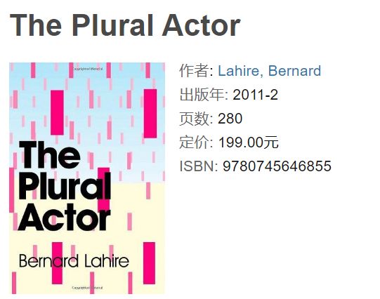 Lahire作为布迪厄的徒孙,在1998年出版专书:L'Homme pluriel. Les ressorts de l'action, Paris, Nathan, 也有英译本,Lahire, Bernard. 2011. The Plural Actor. 1 edition. Cambridge, UK; Malden, MA: Polity,可谓是专门和布迪厄的惯习理论对话的一本著作(感觉康师惠赠扫描版)。