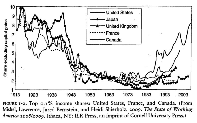 但尽管如此,法国仍算不上很典型的新自由主义模式。因为它采取“补偿型社会政策”。1999年,29.5%的GDP用于社会政策支出,是除了北欧福利国家之外的欧陆最福利的支出国家。可想而见,法国并没有因为新自由主义浪潮而变得收入更不平等。20世纪末的top 0.1%的收入和1973年仍没有多少区别。