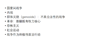 下面的分类既包括战争,也包括不是战争但与之相关的集体暴力形式。
