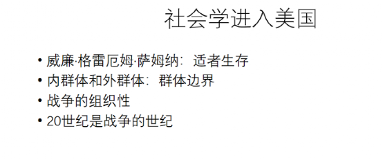 到19世纪末,社会学进入美国。起初的代表人物是威廉·格雷厄姆·萨姆纳(William Graham Sumner),他任教于耶鲁大学,是美国第一个开设社会学课程的人。萨姆纳是古典自由主义者,和斯宾塞有很多类似的地方,比如他主张适者生存,这使我们想起斯宾塞。他提出内群体和外群体的关系问题,这在我看来其实是一个当代人所说“群体边界”的现代概念,也就是说,内群体需要有一个外群体来映射它,外群体会促进内群体身份边界的形成。他同时还强调战争的组织性,这对后来的军事社会学产生了影响。然而,萨姆纳不如斯宾塞那么乐观,他甚至预言20世纪是战争的世纪,从历史来看,他的预言比斯宾塞更加准确。
