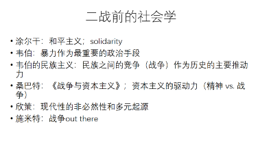 在第二次世界大战之前的社会学中,埃米尔·涂尔干(Émile Durkheim)的和平主义色彩可能是最浓厚的。可能正因如此,他对于战争的理解,或者说对于国家之间的战争的理解,可能是相对最幼稚的一个。涂尔干对战争理解不足,很大程度上是因为他过于强调solidarity,即“团结”,他用这个词来分析暴力冲突或者说有组织的暴力冲突。