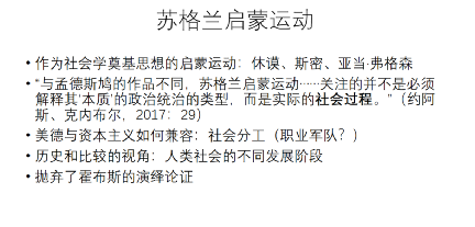 其次,苏格兰启蒙运动把它理解为美德与资本主义如何兼容的问题。也就是说,在有了社会分工以后要不要有职业军队的问题。可以看到,苏格兰启蒙运动有一些非常模糊的,或者说非常朦胧的社会发展理念。这里隐含的意思是,随着社会演化一步步演化,到了一定的阶段,战争会慢慢变少。苏格兰启蒙运动没有采用霍布斯的演绎论证,相反,在我看来它是一种经验研究,或者说是一种历史研究,更多从历史的角度来论证。