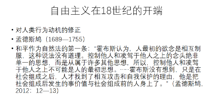 霍布斯之后便是自由主义在18世纪开端的发展,这里必须要谈到孟德斯鸠(Montesquieu)。在霍布斯之后,理论家对于霍布斯的人类行为动机假设有很多修正。孟德斯鸠在《论法的精神》第一章就反驳霍布斯,他说所谓的自然状态没有道理,因为霍布斯没有意识到,只有在社会组成之后才有可能发生战争性的武力冲突。也就是说,战争是社会的一个后果,先于独立的个人,是先有了共同体,然后才有了战争,而不是战争源于人,或等于自然状态本身。此外,孟德斯鸠提到贸易对于和平的促进作用,这里的说法一直影响到我们当代对于战争的理解,收入“经典与解释”丛书的《孟德斯鸠的自由主义哲学》对此有所探讨。