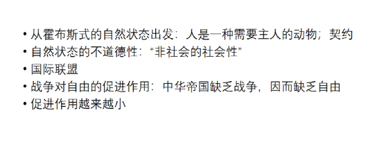 首先,康德赞成霍布斯的演绎法,认同所谓自然状态,他也说人是一种需要主人的动物,因此需要社会契约。但与此同时,康德在此又想把经验研究和规范探讨结合在一起,这与后来的哈贝马斯有所相似。具体说来,他认为自然状态,或者说“非社会的社会性”,是一种不道德的状态。这就是说,他一方面认同霍布斯的自然状态,但是并不赞同霍布斯认为这种状态不存在任何规范性的看法,而是坚持认为这种状态是不合理的或者说是不道德的。正因如此,他提出了国际联盟的构想。此外,康德还提到战争对自由的促进作用,以历史上的帝制中国为例,他认为正是因为缺乏战争,所以帝制中国才缺乏自由。尽管这个观点看上去非常荒谬,但这或许正是我们后人可以将其适当社会学理论化的内容,例如说进行社会机制的重构。
