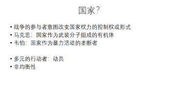 刚才说,战争并不一定以国家为唯一的参与者,但是反过来,战争的参与者肯定在某种程度上都试图改变国家政权的控制权或形式:要么是夺取国家政权,要么是让这个政权符合战争参与者的意愿。