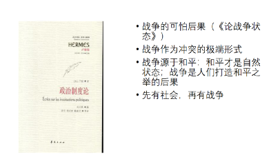 卢梭的《政治制度论》已收入“经典与解释”丛书,这本书其中一篇文章题为《论战争状态》,卢梭在这里谈到了战争的可怕后果,并提出了一个很有名的论断,而这个论断与霍布斯恰好相反。简单地说,霍布斯认为和平源于战争,但是,卢梭认为战争源于和平。具体说来,卢梭认为人类的本性是一张白板,和平才是真正的自然状态,战争是人类为打造和平而做的各种准备。卢梭这里的观点可总结为人类之所以有战争是因为人类害怕战争,这看起来是个悖论,他的很多观点值得进一步探究。