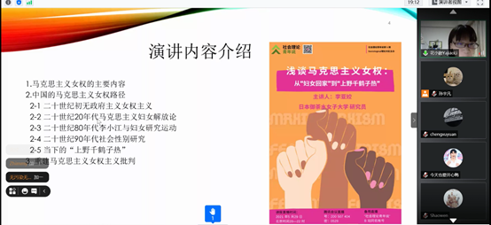第5讲(2021年5月)是由日本御茶女子大学研究员李亚姣老师分享的《浅谈马克思主义女权的路径:从“妇女回家”到“上野千鹤子热”》。