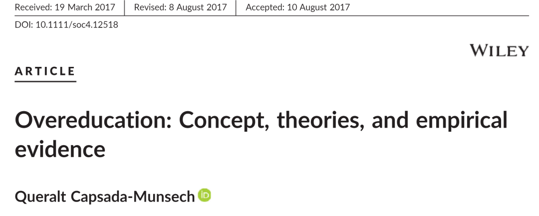 英国格拉斯哥大学教育社会学专家Queralt Capsada-Munsech在期刊Sociological Compass上于2017年发表过一篇综述文章,总结了社会学对过度教育(overeducation)的看法。