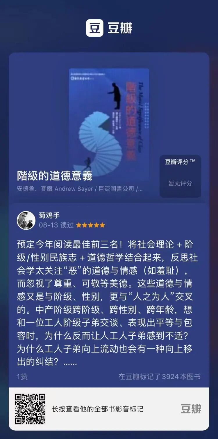 作者Andrew Sayer是我的博论要研究的人物之一,所以也要找来他近年作品来看看。这本书的译者之一也是我的硕导万毓泽。虽然非常难读(太理论),但结合了民族志、道德哲学和社会学理论,真是非常精彩。我的豆瓣书评是见图。