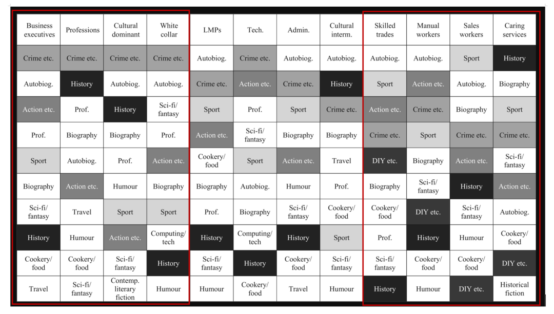 尽管大家普遍在看食物、犯罪类、幽默类的书籍,但是只有较高社会阶层才会看“当代文学小说”这一体裁。这种体裁阅读,需要对知识背景有一定要求,不是直接掌握的。