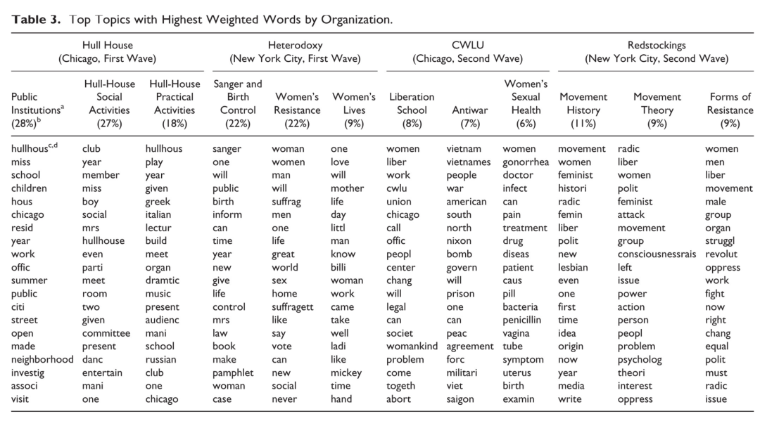 结果作者发现,纽约的女权运动更喜欢谈一些比较宽泛、大的词汇,比如history, liberation, feminist,相较来看,芝加哥则不然,会有更高频的主题词汇是很具体的,比如abortion, Nixon, hospital, school, and members。因此:纽约更抽象、芝加哥更实在,反映了两个地方的社会运动的不同基调。
