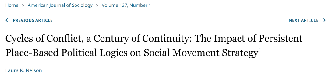 Nelson, Laura K. 2021. “Cycles of Conflict, a Century of Continuity: The Impact of Persistent Place-Based Political Logics on Women’s Movement Form.” American Journal of Sociology 127 (1): 1-59.