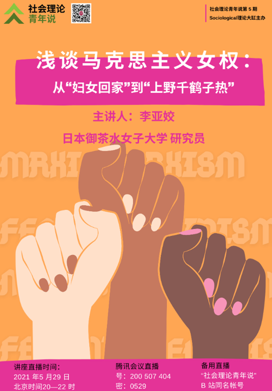 第5讲(2021年5月)是由日本御茶女子大学研究员李亚姣老师分享的《浅谈马克思主义女权的路径:从“妇女回家”到“上野千鹤子热”》。