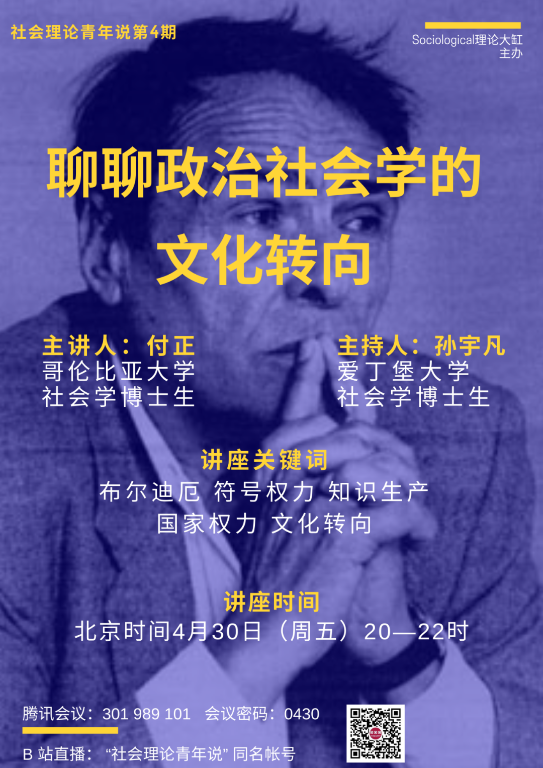 第4讲(2021年4月)是由哥伦比亚大学社会学博士生付正同学分享的《聊聊政治社会学的文化转向》。