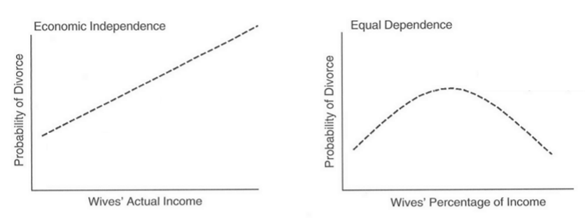 Silver教授认为鉴于过去的社会和家庭是以男性占主导,但随着妻子实际收入的增加,她们在经济上更加独立于丈夫,从而有可能走向选择离婚。但是,相较于实际收入,我们更应该看妻子收入在家庭收入中的占比,因为这也可能是倒U型关系——当夫妻双方对家庭的贡献相较一致,都50%左右,各自独立,相互义务感减弱,最可能离婚。反过来,如果在家庭收入中,一方贡献过于显著,意味有较强的经济依赖关系,则离婚可能性相对较低。见下图。