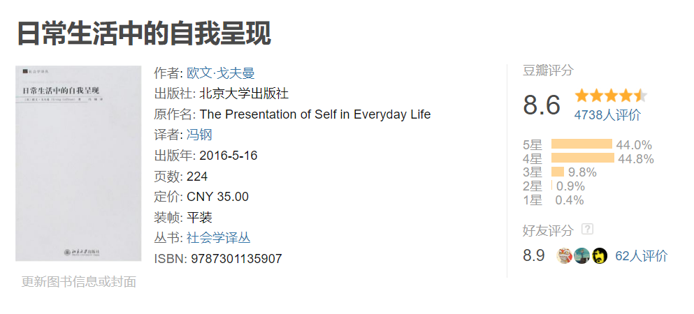 因此,社会学家在研究performance概念时,从戈夫曼的《日常生活的自我呈现》开始,就聚焦在“台前表演”与“深度/幕后实在”,比如我是一个内向的、一个人时候不爱说话的人,但其实在工作的时候却表现得有社交牛逼症。