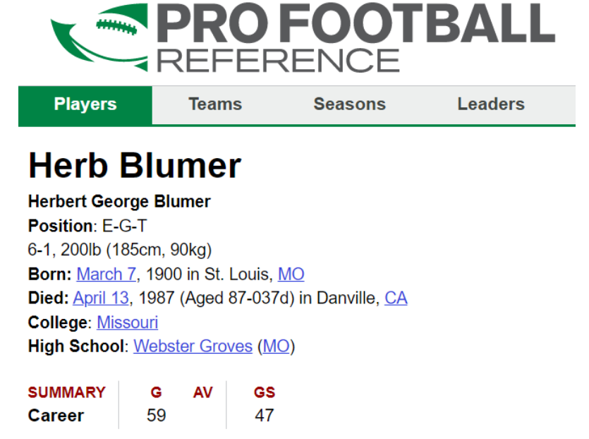 Blumer was a member of the 1929 All-Pro Team. He played a total of 58 games for Chicago.