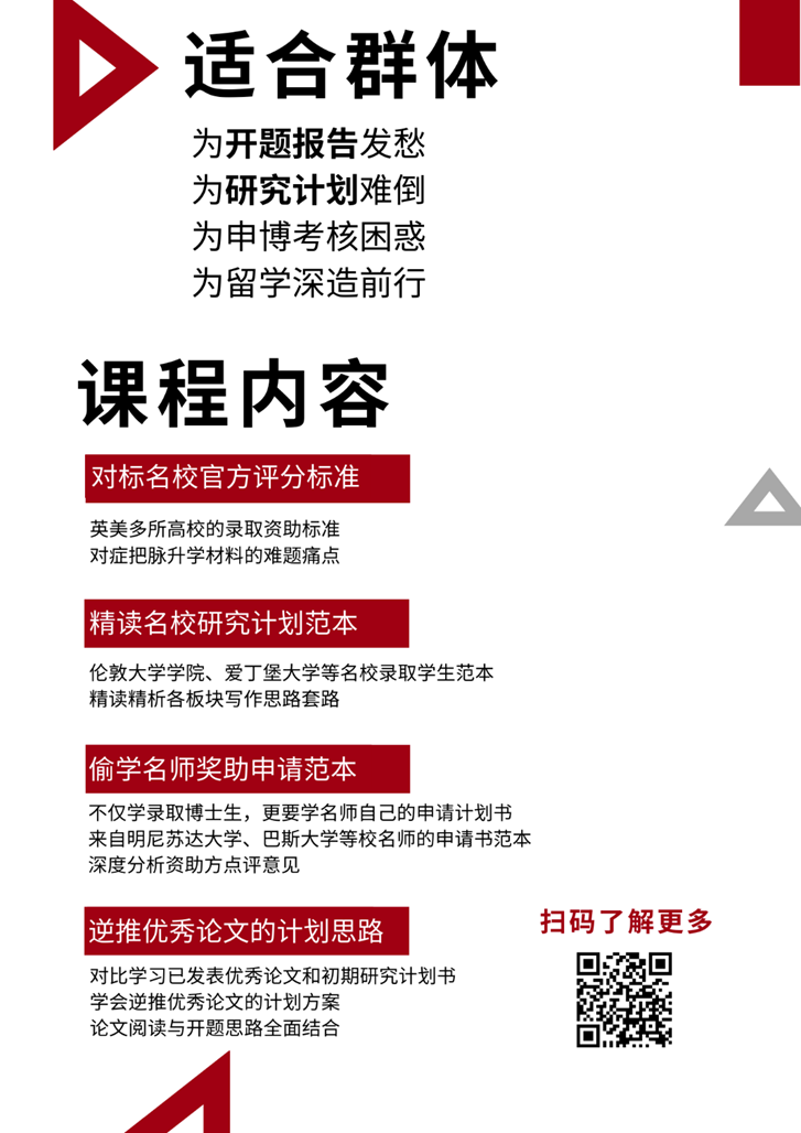 如果你在准备硕论或博论开题报告,希望搞懂怎么准备。这个课程同时适合你。就像爱丁堡大学对博士开题报告的要求所说——a full research proposal(完整版本的研究计划,其实就是拓展到申请时研究计划的5-8倍)。