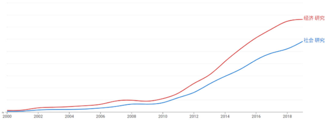 (2000~2019年的谷歌图书大数据的词频计算:社会学家/社会研究和经济学家/经济研究)