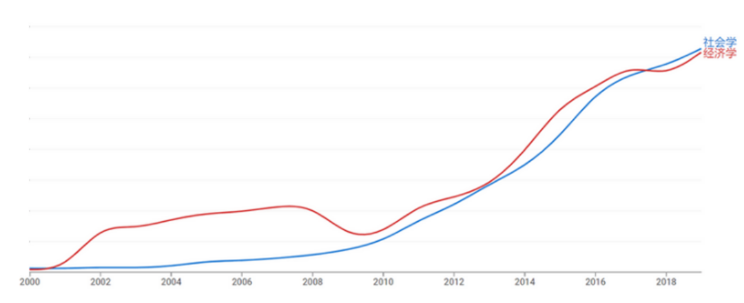 以“谷歌图书大数据”(Google Books Ngram)的关键词频率来看,近五年来社会学已经略微接近甚至超过经济学了。