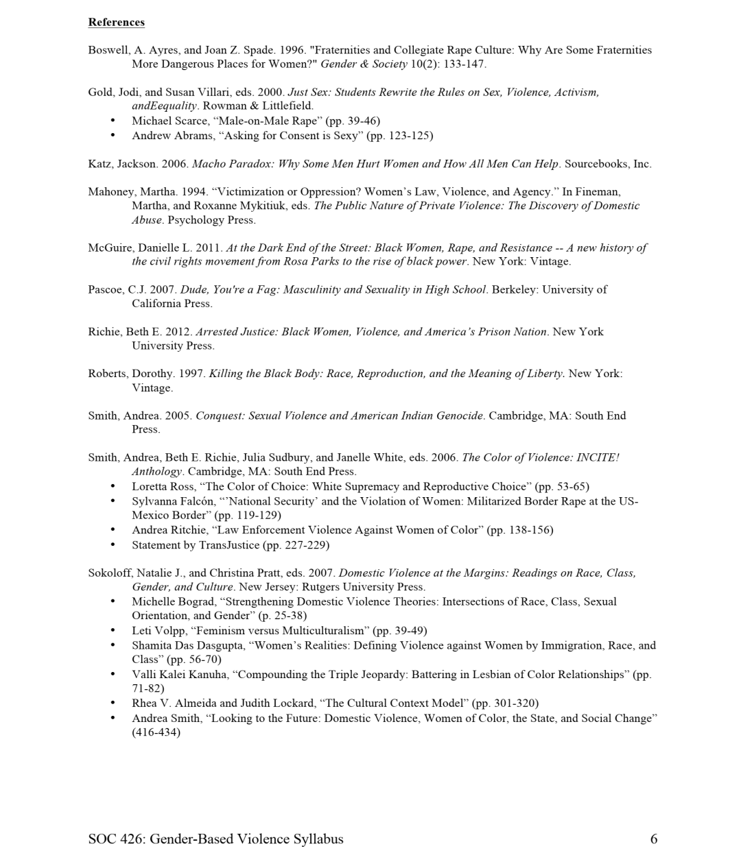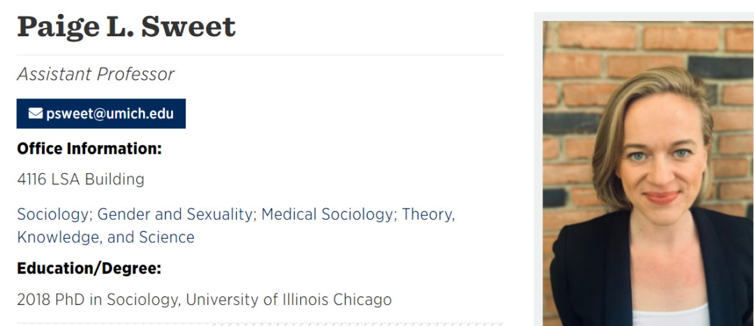 现任密歇根大学社会学助理教授、哈佛大学博士后研究员Paige Sweet,早在读博的时候就开过一门课《性别暴力》(Gender-based Violence)。这门课从“交叉性”概念出发,探讨了性别暴力与种族、殖民暴力等现象之间的关系,也分析了性别暴力的历史(主要是美国)。此外,该课程也涉及到男性气质、性侵文化与性别暴力间的讨论。