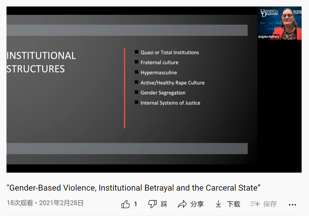 特拉华大学社会学、性别研究教授Angie Hattery,既参与公共发声,也在学校开设了性别暴力方面的课程。除了亲密关系中的暴力问题,她特别关注制度面,尤其是一些制度场景 ——体育、监狱等。2019年,她合著出版了书籍Gender, Power and Violence: Responding to Sexual and Intimate Partner Violence in Society Today。她开设的这门《性别、权力、暴力与身体》(Gender, Power, and Violence & Bodies),颇有特色:不仅带你从上述的各个制度场景研究性别暴力,同时也采用“一周读文本、一周看电影”的方式,促进学生的共情与理解。