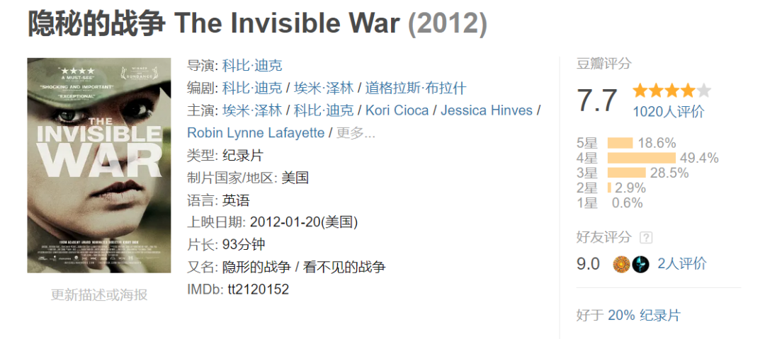 欢乐谷(2014):美国高校橄榄球教练的性侵事件纪录隐秘的战争(2012):揭示美军性侵丑闻的,提名了奥斯卡最佳纪录长片![]()