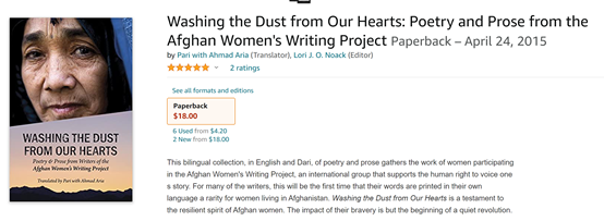这个组织还在2015年出版了这些阿富汗女性的诗文集《洗涤我们心中的尘埃》(Washing the Dust from Our Hearts: Poetry and Prose from the Afghan Women’s Writing Project)。