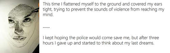 我拿起笔来写的时候,一开始很害怕:写什么?关于什么?写作项目给了我一个声音,让我有了作为一个女性的勇气,讲述自己的生活,分享我的痛苦和经历。