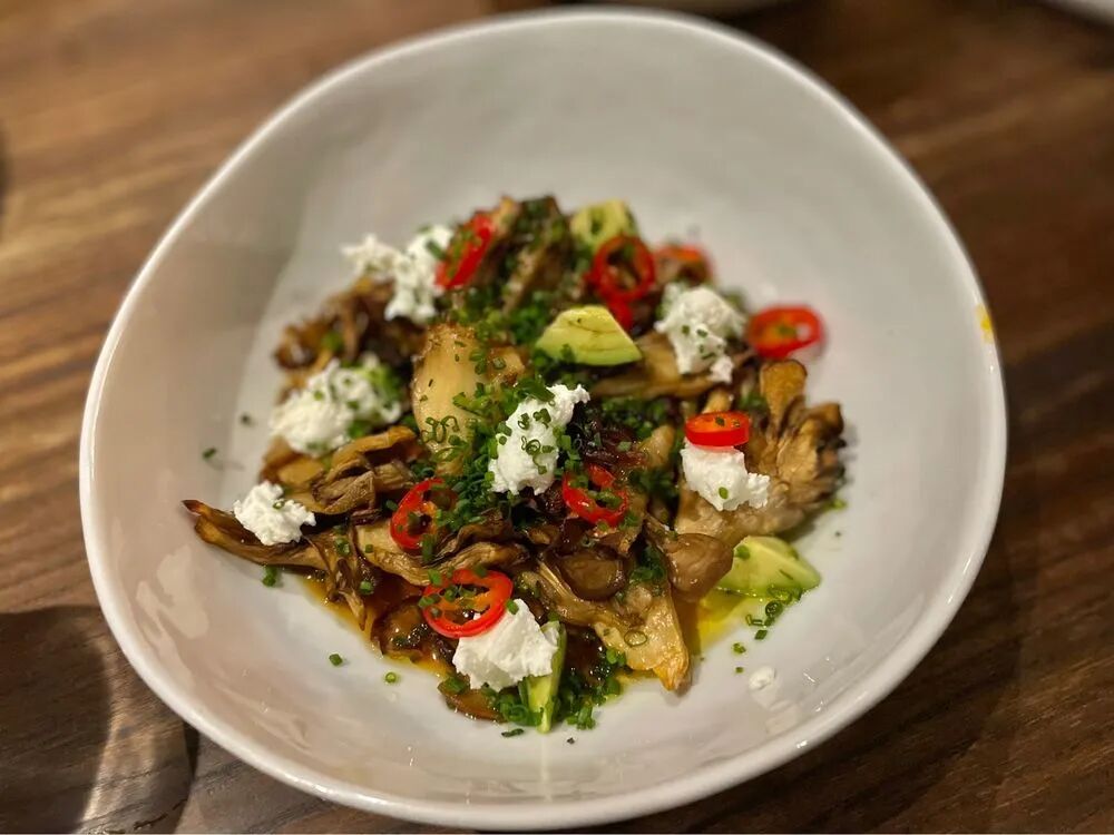 热盘蘑菇沙拉,酸酸甜甜的,蘑菇的香味和牛油果的清爽有了很好的中和。