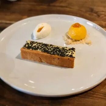 黑芝麻芝士蛋糕,搭配百香果冰激凌。黑芝麻与芝士的香甜与百香果的酸爽碰撞,是奇妙的味蕾体验