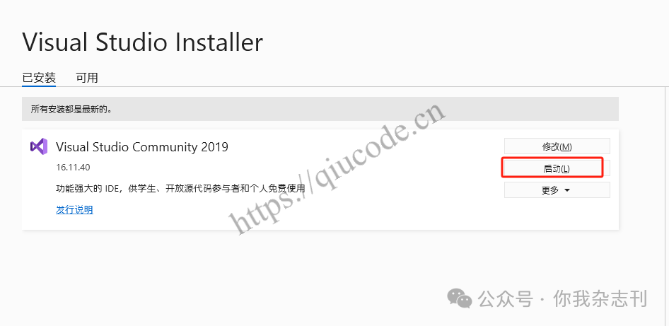 等它过了几炷香的时间,出现了下图,就说明Visual Studio 2019 Community安装成功了,随后我们点击启动它,进行组件安装。
