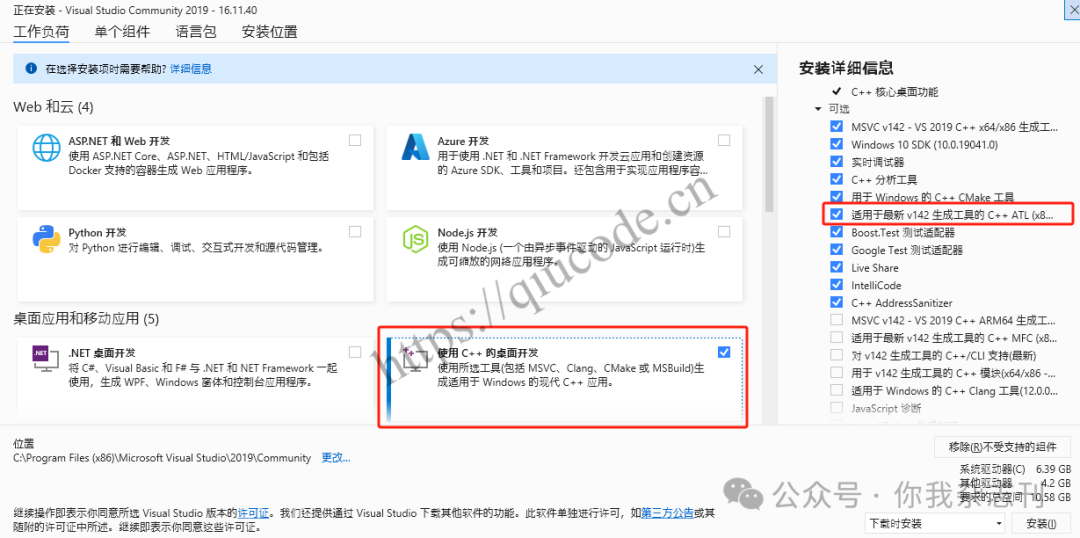 visual studio 2019 community安装的时候,左侧勾选使用 C++ 的桌面开发,右侧勾选 C++ ATL 生成工具,其他项默认就可以了。