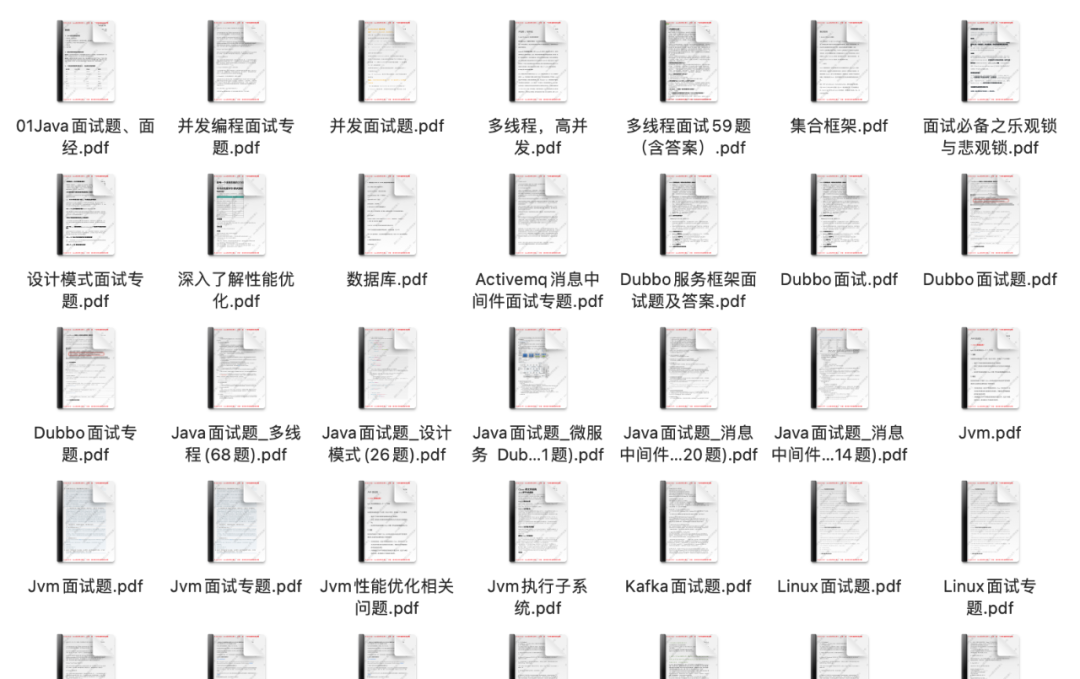 包含Java 集合、JVM、多线程、并发编程、设计模式、Spring全家桶、Java、MyBatis、ZooKeeper、Dubbo、Elasticsearch、Memcached、MongoDB、Redis、MySQL、RabbitMQ、Linux等面试题!