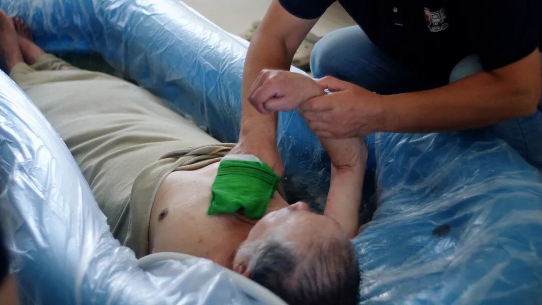 助浴师们一边熟练地摆放抽排水泵、水管和充气浴槽,一边和热情地和老人寒暄。「欸!」「嗯!」姜爷爷讲话艰难,只能尽力吐出几个字和词语,但高兴地应答着助浴师们的问候,偶尔轻轻点头。