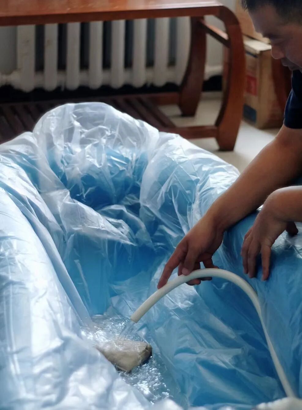 蓝色的充气浴槽是日本进口的,能够保证一边进热水一边排出脏水。老人平躺在里面,肢体舒展,全身浸泡,每一寸皮肤都能够被清洗。一般家庭没有浴缸,平时连淋浴都困难,老人更少有机会享受到这样的泡浴。