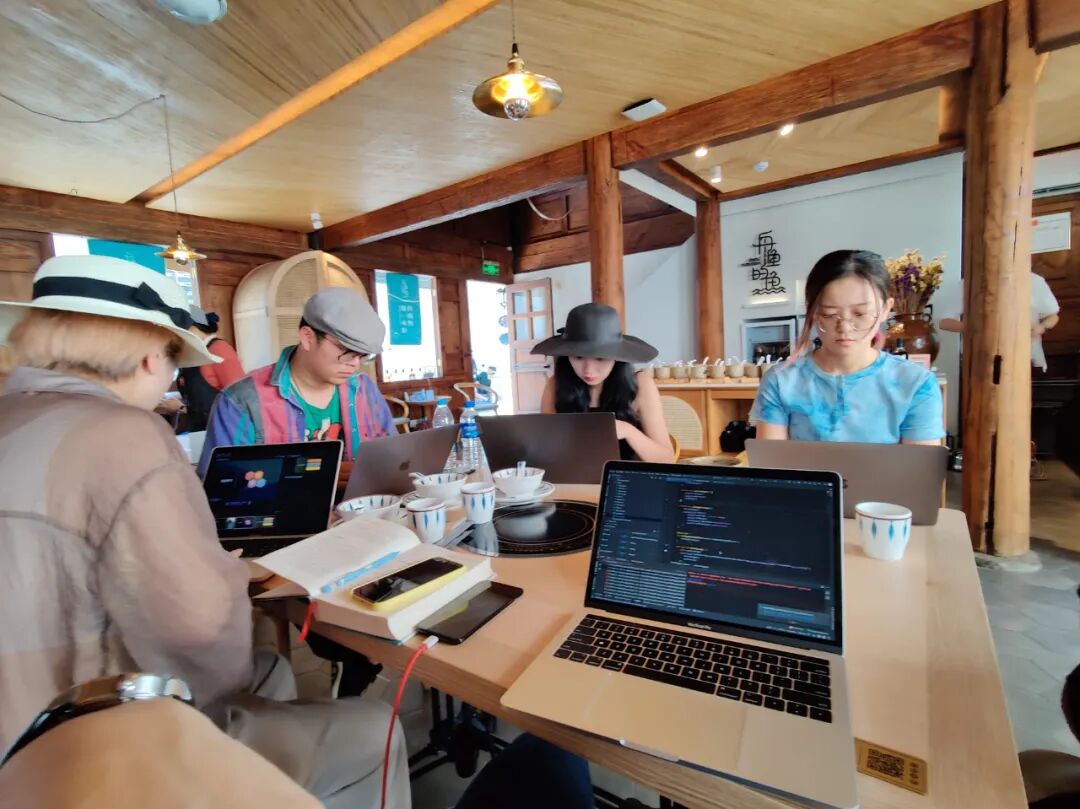 2020年,成为数字游民1年后,Daniel与Yeye在大理古城西石门村合伙开了一家名为Dali Hub的共享办公空间。来这里办公的人也可以说得上是藏龙卧虎,谷歌的工程师,退休的独立开发者,网红博主,清华毕业生……他们没有固定的工位,也不需要通勤,只要有一台电脑,和稳定且高速的网络,就可以在绿植的环绕和咖啡豆的香味中,开启工作模式,并且在结束一天的工作后,相约来一场飞盘。数字游民们在Dali hub的餐厅里办公,图源受访者