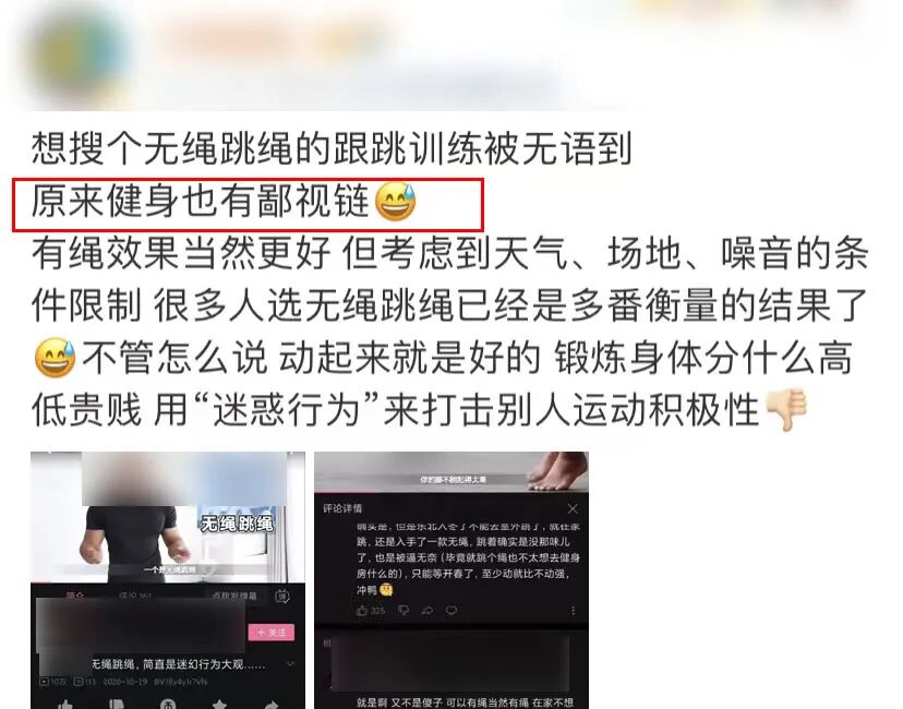原本只想锻炼出美好身材,不成想“直接把腿跳废了”。不少家长操心着孩子们的身高、发育,也会给孩子报跳绳班,甚至进行各种强度测试。一波波的新闻冲击下,让人分不清是在跳绳还是在玩命,线上与线下对比也仿佛“两个世界”。网络上,一个接一个的网红跳绳攻略,令人瞳孔地震的体重对比图占满了手机屏幕;《1200次燃脂挑战》《每天半小时跳出马甲线》……这些带着“速成减脂”“你跳你也行”意味的“分享”铺天盖地。现实中,教程没少收藏、技术没少研究、装备也没少买……却还是越跳越懵,腿脚也越跳越疼。虽说跳绳是一项自主性非常强的运动,但为了让自己坚持下去,以及学到更多的经验技巧,许多网友会选择加入各种运动群、打卡群、运动社区。可随着跳绳的火爆,相关话题的讨论度水涨船高,内容愈发真假难辨。在许多运动博主的包装与创新下,跳绳逐渐与五花八门的KPI挂钩。多个平台都被跳绳教程疯狂刷屏