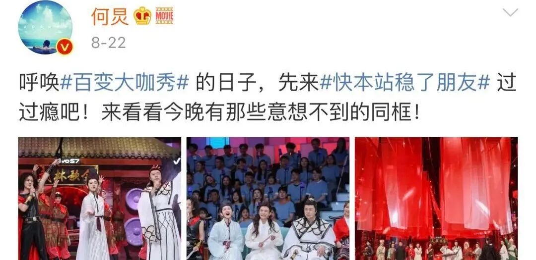 每个人都有自己的角色,即使不负责表演的主持人何炅与谢娜,也是场场“带戏”出镜。