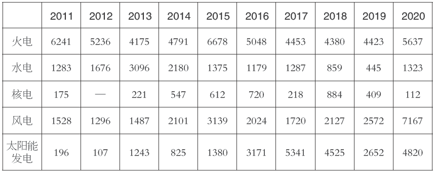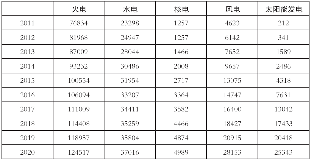 表5-1 2011~2020年全国发电量结构(单位:亿千瓦时)