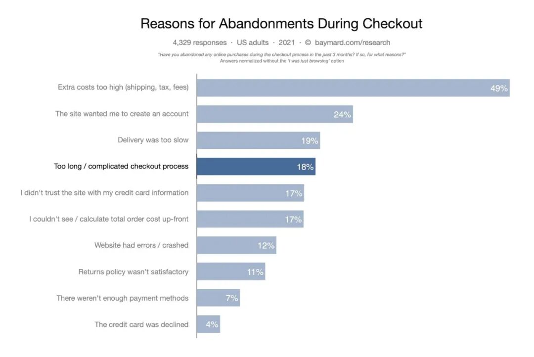 根据文章开头 Baymard 2021 年数据调研图表显示,18% 的消费者因为结账流程过长而导致弃单。