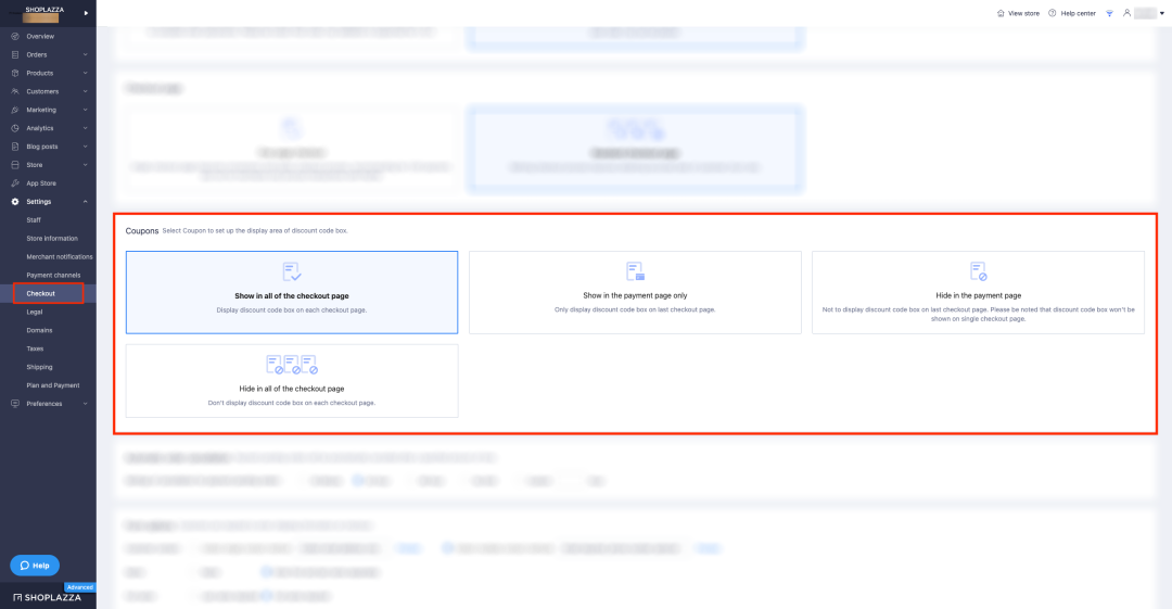 店匠支持商家在结账页面选择是否显示优惠码输入框,其中支持显示在「全部结账页面」、「仅显示在支付页」、「仅支付页不显示」。