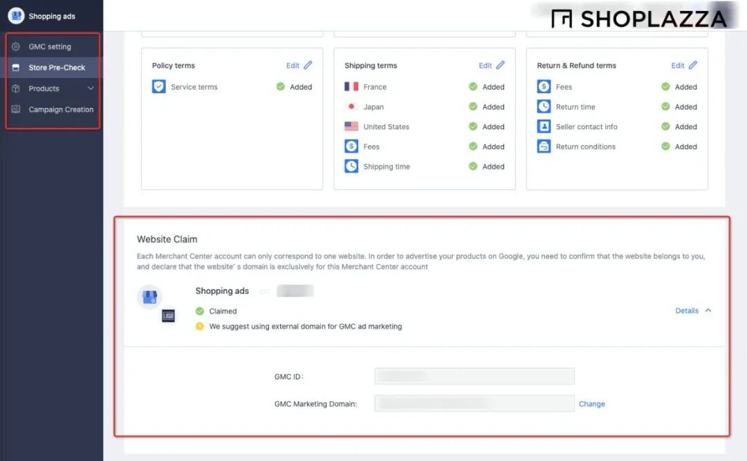 店匠后台「购物广告」中设置「店铺预检」功能的意义在于帮助商家在投放「购物广告」时可以覆盖所有已完成的 GMC 设置和店铺设置,保护投放账号的安全,为商家解决投放痛点,以便他们可以更好地开展广告投放。二:「购物广告」一站式服务