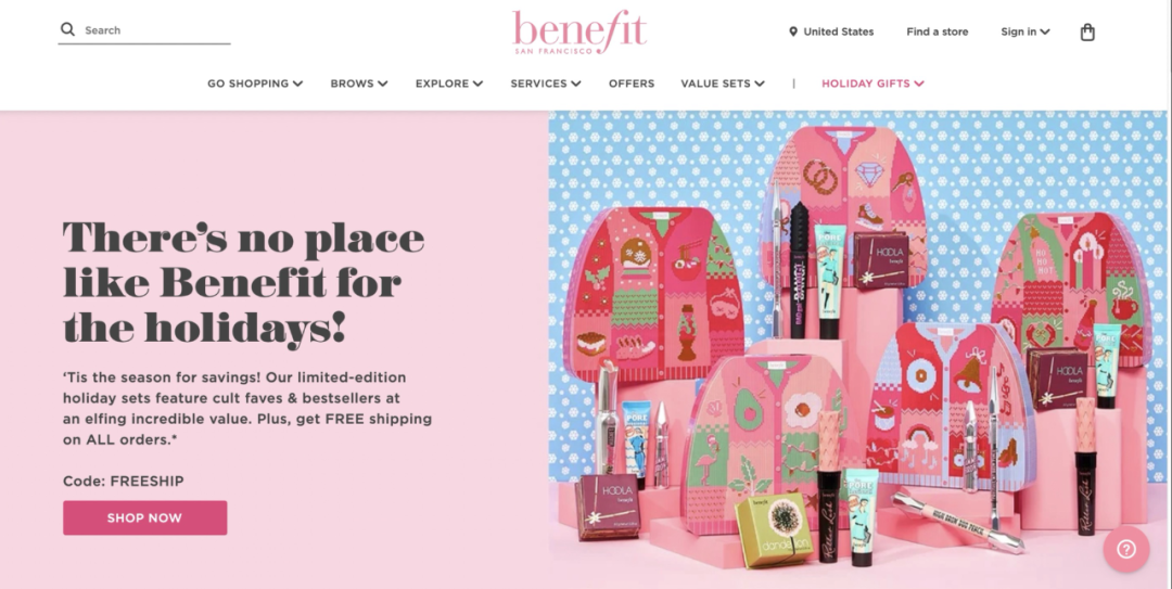 (Benefit Cosmetics 为消费者准备的圣诞礼物套盒)圣诞节本就是人们互送礼物的日子,商家也可以加入到节日中,为您的消费者提供一份免费的冬日暖心礼物。通过在消费者下订单时赠送免费礼物来庆祝节日,可以加强与消费者的联系,为其带来积极的购物体验,提高消费者对品牌的忠诚度。